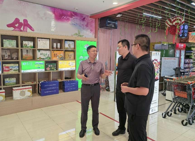 6月21日,赤峰市政府辦公室副主任青龍在中心城區(qū)調(diào)研“赤誠峰味”商超展示工作開展情況,赤峰市城市建設(shè)投資(集團)有限公司“赤誠峰味”品牌運營推進專班成員陪同調(diào)研。