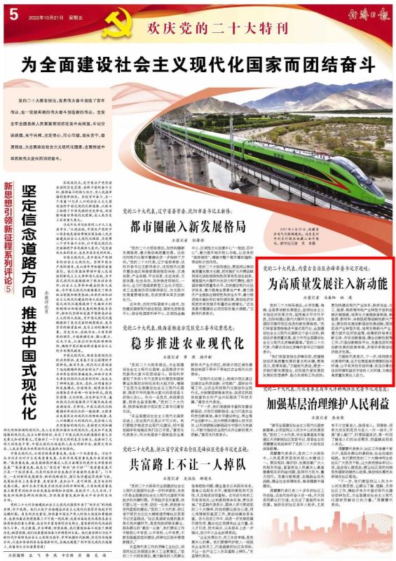 黨的二十大報告提出,必須完整、準(zhǔn)確、全面貫徹新發(fā)展理念,堅持社會主義市場經(jīng)濟(jì)改革方向,堅持高水平對外開放,加快構(gòu)建以國內(nèi)大循環(huán)為主體、國內(nèi)國際雙循環(huán)相互促進(jìn)的新發(fā)展格局?!拔覀儗⒕o緊圍繞推進(jìn)中國式現(xiàn)代化、全面建設(shè)社會主義現(xiàn)代化國家這個奮斗目標(biāo),推動經(jīng)濟(jì)高質(zhì)量發(fā)展,奮力書寫全面建設(shè)社會主義現(xiàn)代化赤峰新篇章?!秉h的二十大代表、內(nèi)蒙古自治區(qū)赤峰市委書記萬超岐表示。